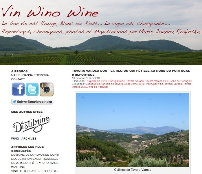 Marie Joanna Roginska é francesa e integrou a comitiva de jornalistas e escritores de vinho (da FIJEV) que estiveram de visita à Expodemo’19 e à região vitivinícola Távora-Varosa. Dessa permanência resultou a reportagem que publicou em várias plataformas digitais da especialidade e que intitulou: “Távora-Varosa, a região cintilante do norte de Portugal”. Pode ser visualizada aqui, aqui e aqui.
