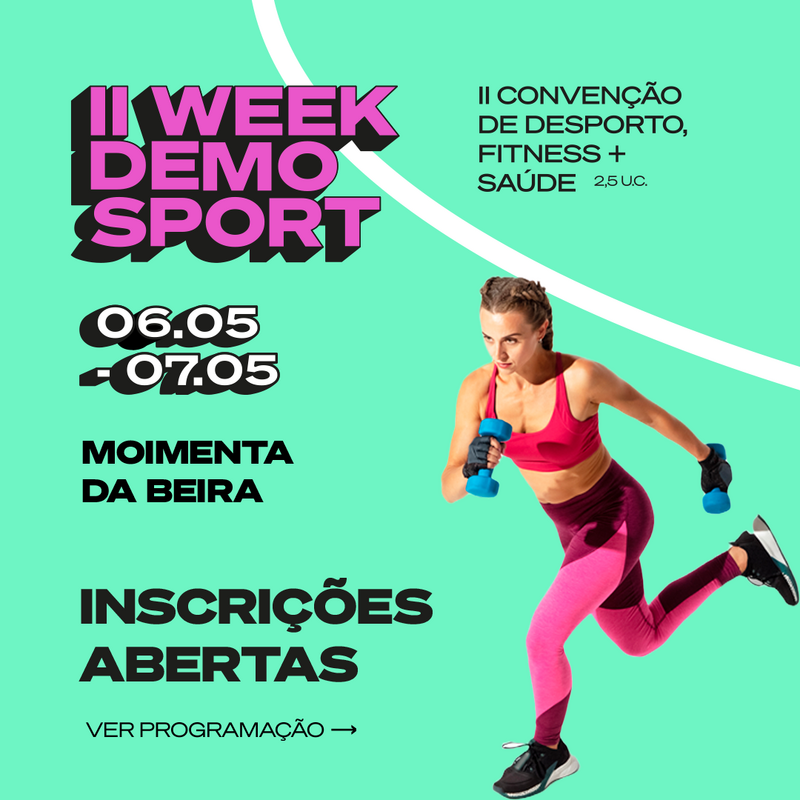 Um ano depois aí está a 2ª Week Demo Sport que se vai realizar no fim-de-semana de 6 e 7 de maio, em Moimenta da Beira. O evento é organizado pela Câmara Municipal e visa contribuir para a saúde, o bem-estar e a qualidade de vida dos cidadãos.