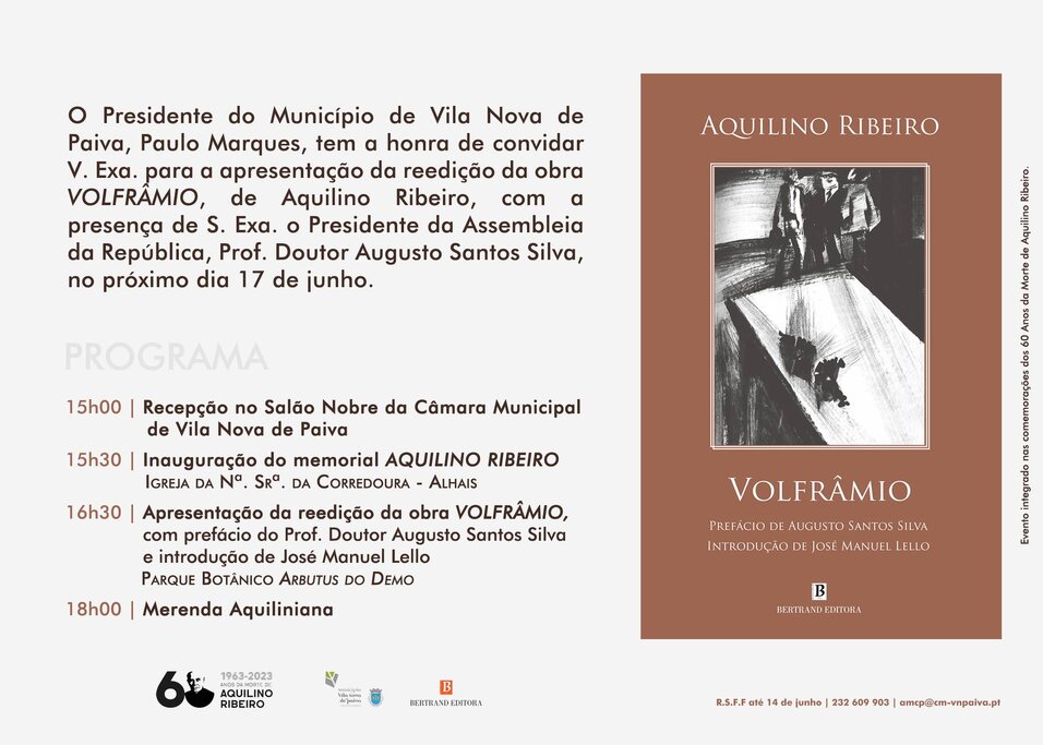 No âmbito das comemorações dos 60 Anos da morte de Aquilino Ribeiro e do programa nacional de eventos que pretende homenagear o escritor e promover os territórios que são parte essencial da sua geografia de vida, os Municípios das Terras do Demo - Vila Nova de Paiva, Moimenta da Beira e Sernancelhe – reeditam em colaboração com a Bertrand Editora três obras essenciais do extenso catálogo literário de Aquilino Ribeiro.