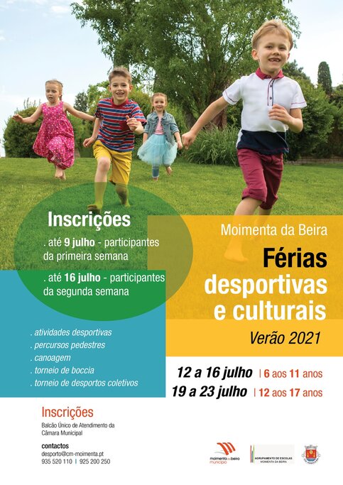 Está aberto o período de inscrições para as Férias Desportivas e Culturais Verão 2021 de Moimenta da Beira. O evento é destinado às crianças e jovens do concelho e vai desenvolver-se em dois períodos: o primeiro de 12 a 16 de julho, para as crianças dos 6 aos 11 anos de idade; e o segundo de 19 a 23 de julho, para as crianças e jovens dos 12 aos 17 anos. As inscrições estão abertas até dia 9 de julho, para os participantes da 1ª semana, e até ao dia 16 julho, para os participantes da 2ª semana.