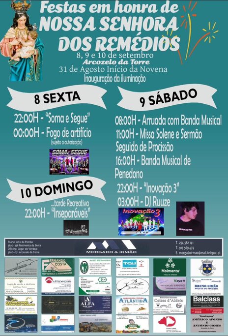 As tradicionais festas em honra de Nossa Senhora dos Remédios vão animar o Arcozelo da Torre, Moimenta da Beira, de 8 a 10 de setembro. O programa de três dias promete muita diversão, mas o grande dia decorrerá no próximo sábado com a celebração da Missa Solene e Sermão seguido de Procissão.