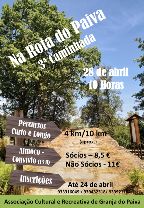 Realiza-se no próximo domingo, 28 de abril, a partir das 10 horas, a 3ª Caminhada “Na Rota do Paiva". Com meta de partida na Associação Cultural e Recreativa de Granja do Paiva, a iniciativa contará com dois trajetos: um curto de 4 km e um longo de 10 km.