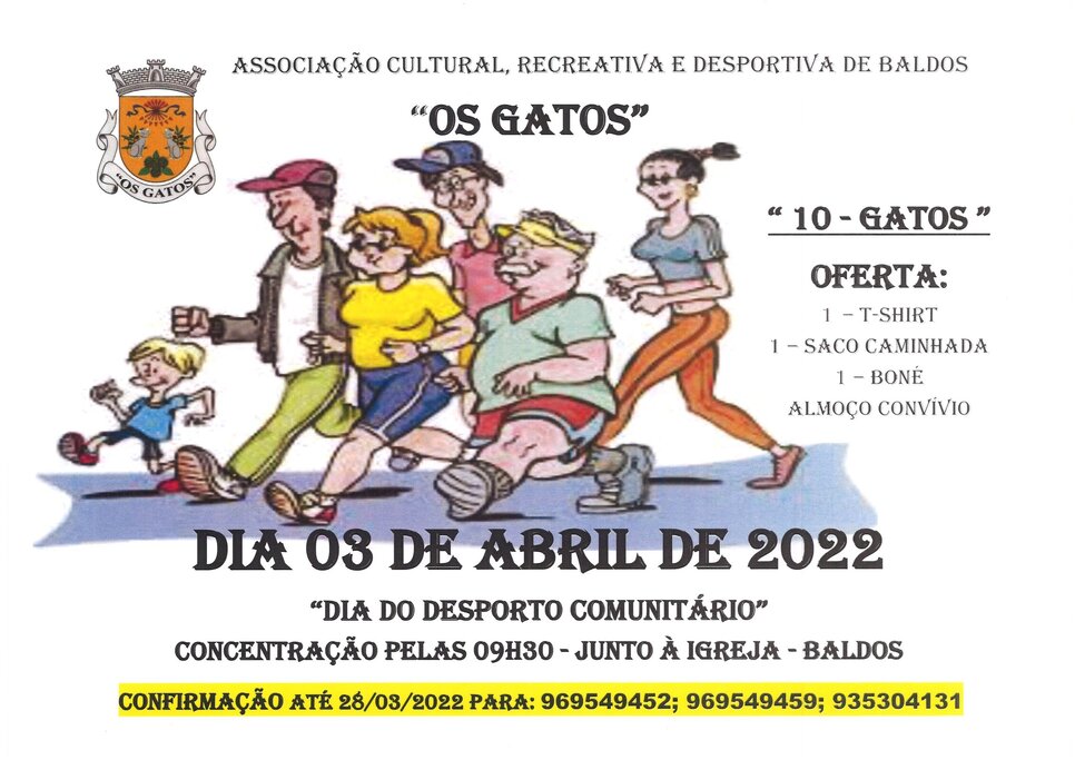 Para assinalar o Dia do Desporto Comunitário, que se celebra a 3 de abril, a Associação Cultural, Recreativa e Desportiva de Baldos “Os Gatos” preparou um programa que inclui caminhadas com percursos de 5 e 10 km. A concentração será feita no dia 3 de Abril, pelas 9h30, junto à Igreja de Baldos.