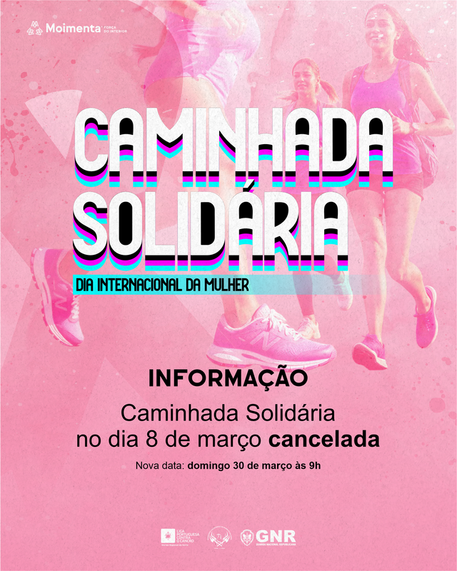 Informamos que, devido às condições climatéricas adversas previstas para o dia 8 de março, a Caminhada Solidária foi cancelada e irá ser reagendada para o dia 30 de março às 9h. O período para as inscrições será alargado até 27 de março e o restante da programação irá manter-se.