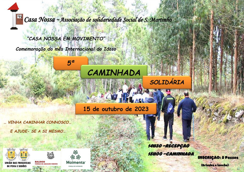 No mês em que se celebra o Dia Internacional do Idoso, mês de outubro, a “Casa Nossa – Associação e Solidariedade Social de S. Martinho”, em Peva, vai promover na tarde do dia 15 de outubro, que coincide com um domingo, a 5ª Caminhada Solidária. A receção dos caminhantes está agendada para as 14h30, já o passeio tem saída marcada para as 15 horas.