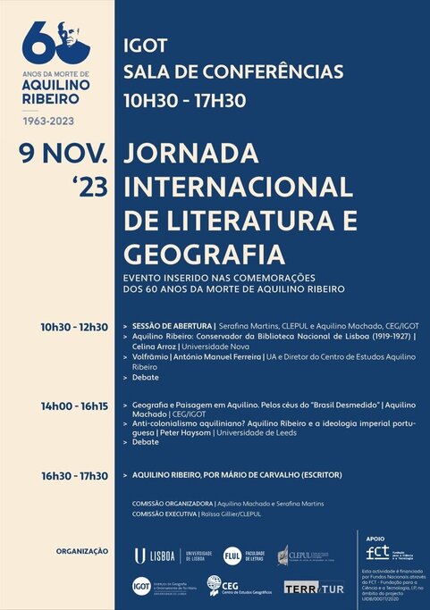 Inserida na programação nacional das comemorações dos 60 anos da morte de Aquilino Ribeiro, o Centro de Literaturas e Culturas Lusófonas e Europeias da Universidade de Lisboa (CLEPUL) e o GI TERRITUR do Centro de Estudos Geográficos (CEG/IGOT) – ULisboa, vão organizar no dia 9 de novembro a Jornada Internacional de Literatura e Geografia. O evento decorrerá na Sala de Conferências Jorge Gaspar (IGOT), das 10h30 às 17h30.