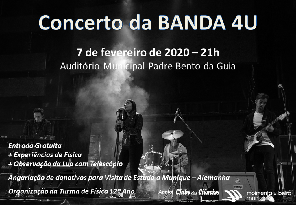 A Turma de Física (12º Ano) do Agrupamento de Escolas de Moimenta da Beira, da responsabilidade do docente Paulo Sanches, vai levar a efeito na próxima sexta-feira, 7 de fevereiro, pelas 21h, no Auditório Municipal Padre Bento da Guia, um concerto da Banda 4U, que é constituída pelos alunos de Física (12º) Guilherme Nunes e Rui Soares, acompanhados pela aluna Margarida Alves e o ex-aluno Rodrigo Vicente. Neste concerto, além de boa música haverá algumas experiências de Física e, no final, a oportunidade de observações à Lua com telescópio, caso as condições meteorológicas o permitam.