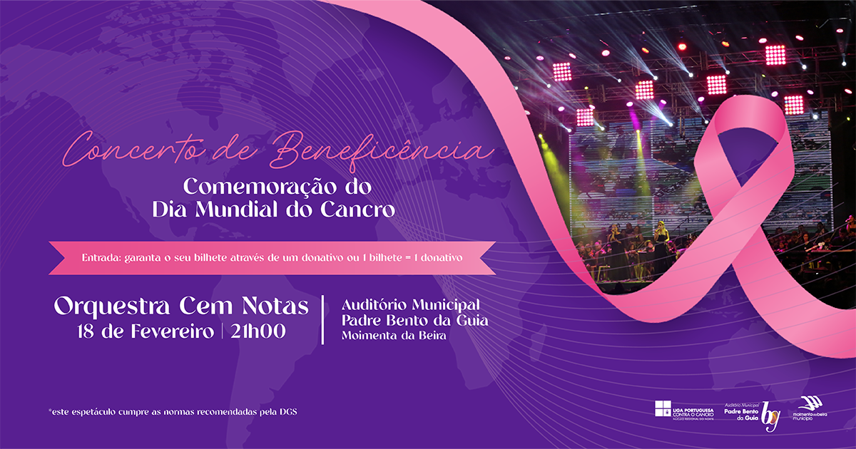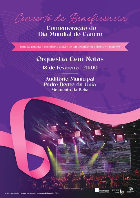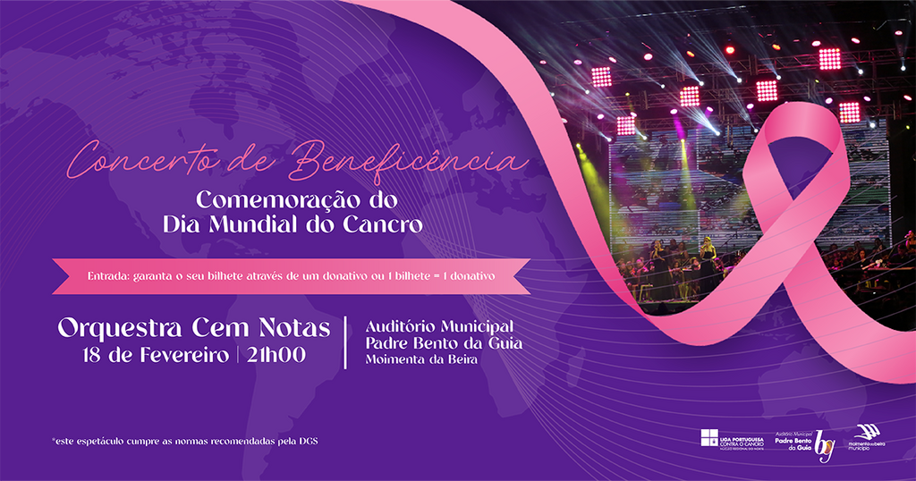 Garanta o seu bilhete através de um donativo e solidariamente assista, esta sexta-feira, dia 18, ao Concerto de Beneficência comemorativo do Dia Mundial do Cancro proporcionado pela Orquestra Cem Notas no Auditório Municipal Padre Bento da Guia, em Moimenta da Beira, a partir das 21 horas. O produto do seu donativo reverterá na totalidade para a Liga Portuguesa Contra o Cancro. O concerto cumpre todas as normas recomendadas pela DGS.