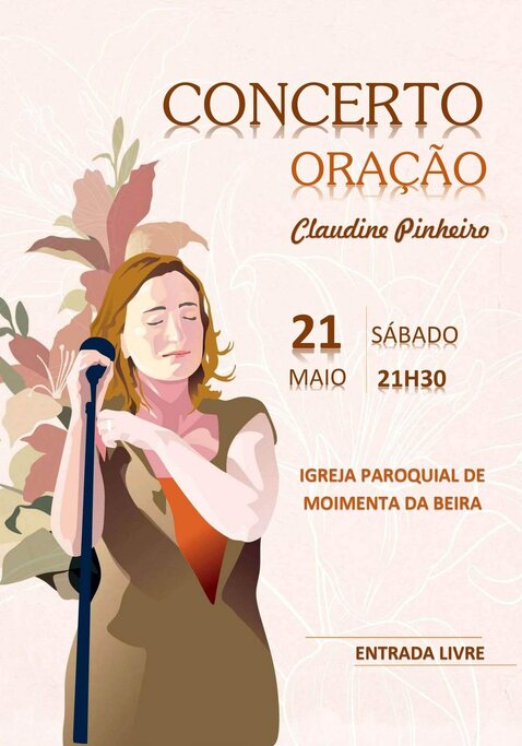 Esperam-se momentos únicos na Igreja Paroquial de Moimenta da Beira, no sábado, dia 21 de Maio, às 21h30, com um Concerto Oração pela voz da conhecida cantora católica Claudine Pinheiro. Um convite à interiorização da mensagem bíblica de uma forma original e intimista.