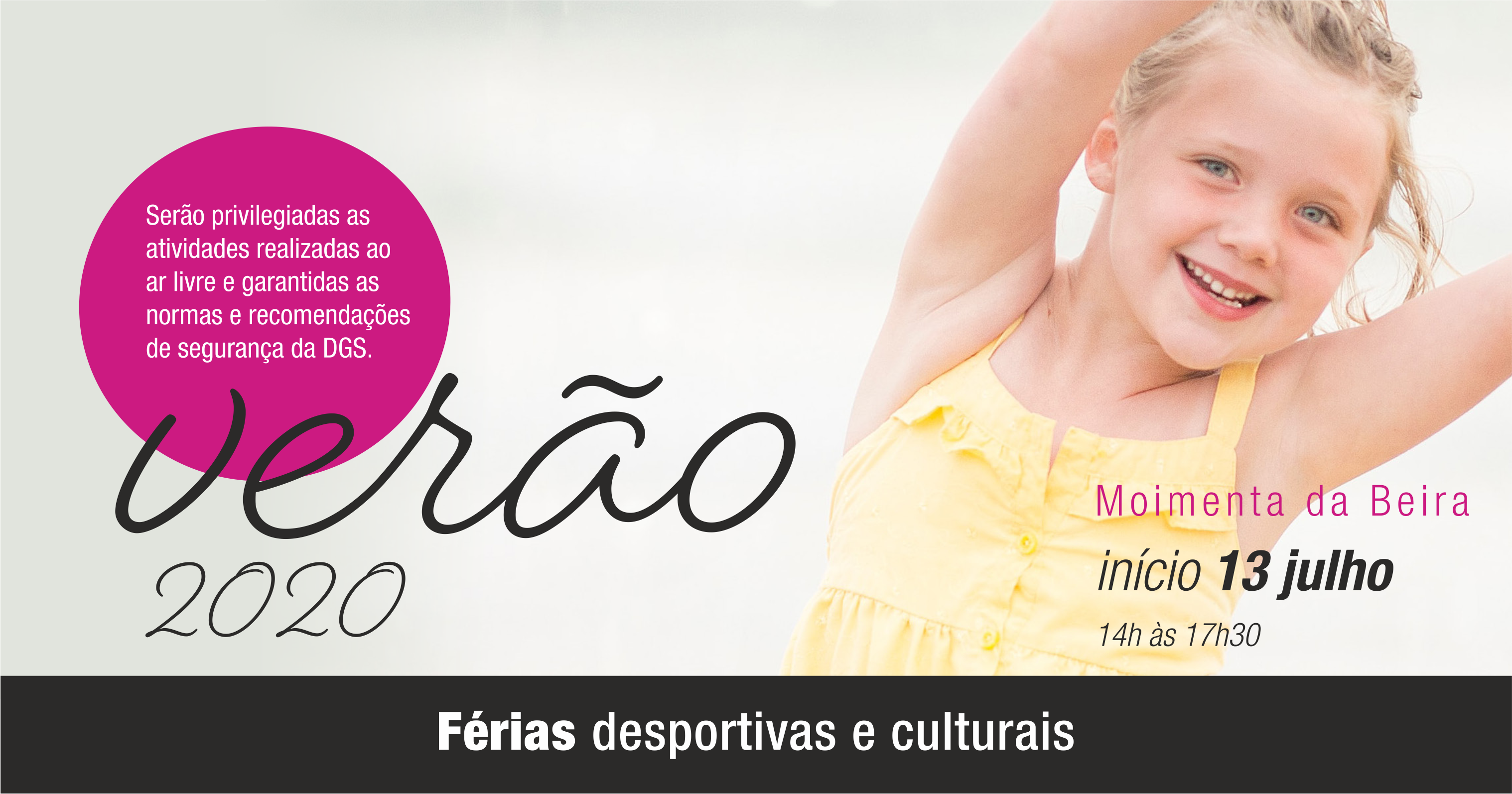 Mantém-se aberto o período de inscrições para as Férias Desportivas e Culturais Verão 2020. Trata-se de uma iniciativa de ocupação com qualidade dos tempos livres dos jovens do concelho durante o Verão, com todas as atividades acompanhadas por profissionais qualificados da Câmara Municipal de Moimenta da Beira e desenvolvidas com muito empenho e dinamismo.