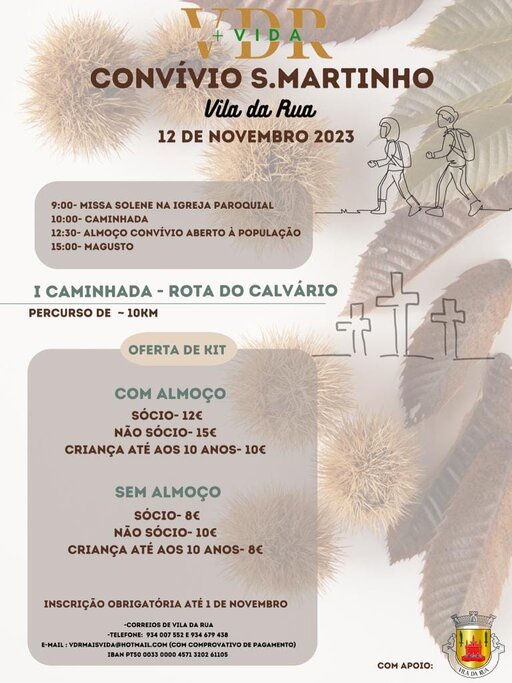 Estão abertas até dia 1 de novembro as inscrições (obrigatórias) para a “I Caminhada - Rota do Calvário”, em Vila da Rua. A jornada, de 10 km, que vai sair à rua no dia 12 de novembro, está inserida na programação do ‘Convívio de S. Martinho’ que contará nesse dia com outras atividades, entre elas uma Missa Solene na Igreja Paroquial, um almoço convívio aberto a toda a comunidade e ainda o tradicional magusto.