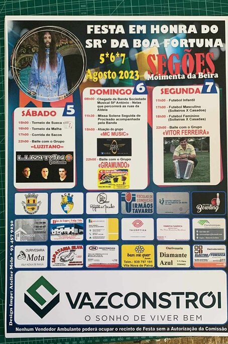 Por fim, em Segões, a festa em honra do Senhor da Boa Fortuna, durará três dias: 5, 6 e 7, sábado, domingo e segunda, respetivamente.