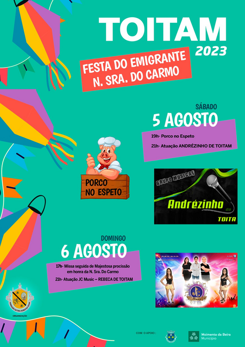 No sábado e domingo, 5 e 6 de agosto, é a vez de Toitam receber a Festa do Emigrante e de Nossa Senhora do Carmo. Também nos mesmos dias, os festejos em honra de Nossa Senhora das Angústias darão vida à aldeia de Mileu, na freguesia de Caria. Como sempre, a tradicional festa em honra do Senhor da Boa Passagem será celebrada em Sanfins, no primeiro domingo do mês de agosto.