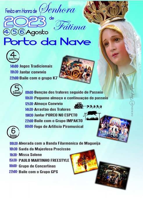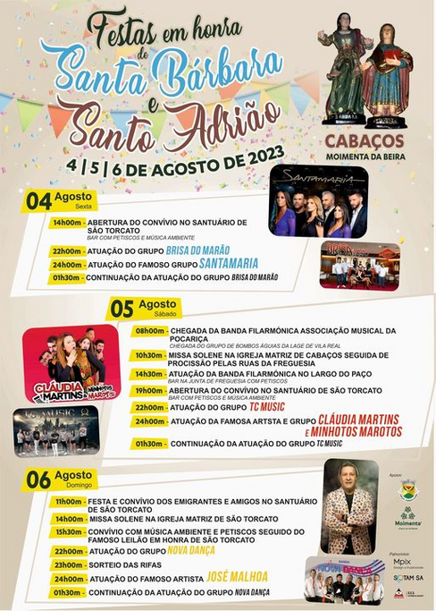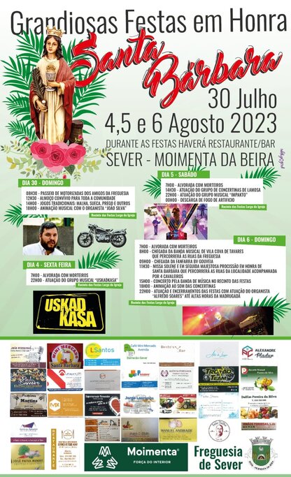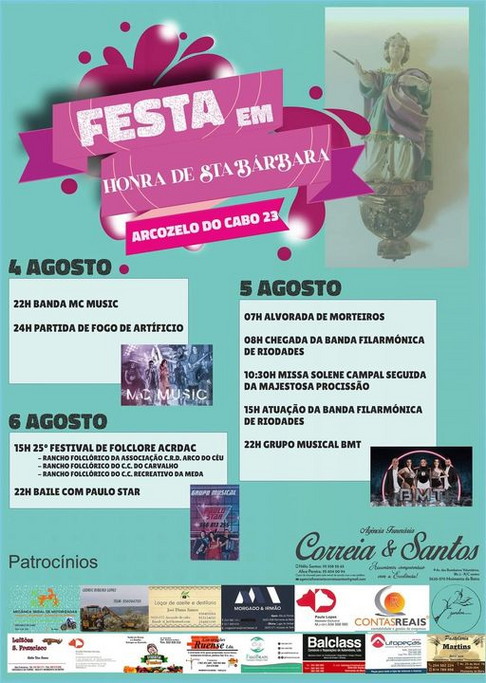 Já nos dias 4, 5 e 6 deste mês, Arcozelo do Cabo receberá os festejos de Santa Bárbara, Cabaços viverá as festas de Santa Bárbara e Santo Adrião, Porto da Nave honrará a Nossa Senhora de Fátima, Sever acolherá as Grandiosas Festas de Santa Bárbara, e Ariz celebrará as festividades do Imaculado Coração de Maria.