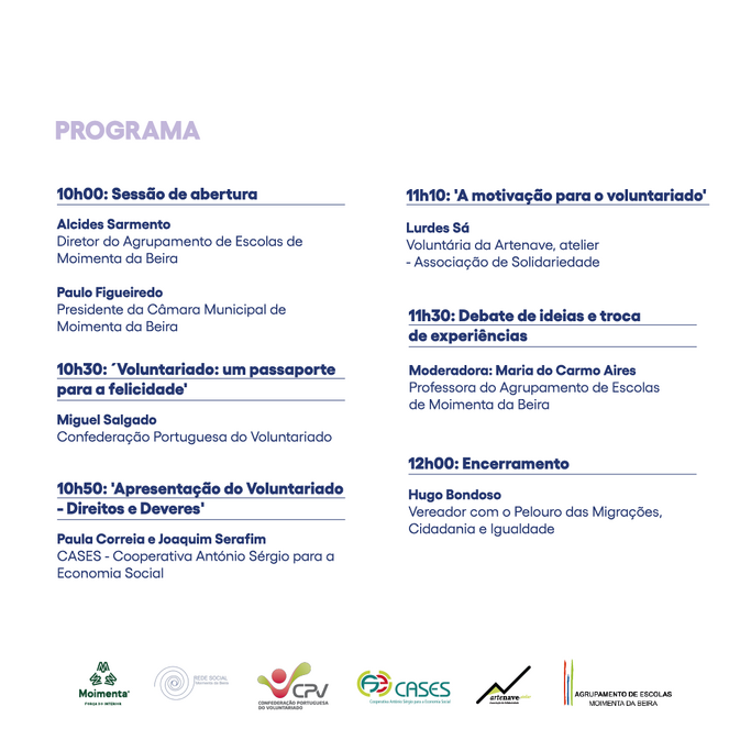 Mas não só! O programa, com sessão de abertura pelo Presidente da Câmara, Paulo Figueiredo, e pelo Diretor do Agrupamento de Escolas, Alcides Sarmento, vai contar com o valoroso testemunho de uma voluntária (Lurdes Sá) e um debate de ideias e troca de experiências moderado por Maria do Carmo Aires, docente da escola. A sessão de encerramento, essa estará a cargo do Vereador com o Pelouro das Migrações, Cidadania e Igualdade, Hugo Bondoso. O objetivo da iniciativa é conseguir despertar e incentivar os jovens para a prática do voluntariado.