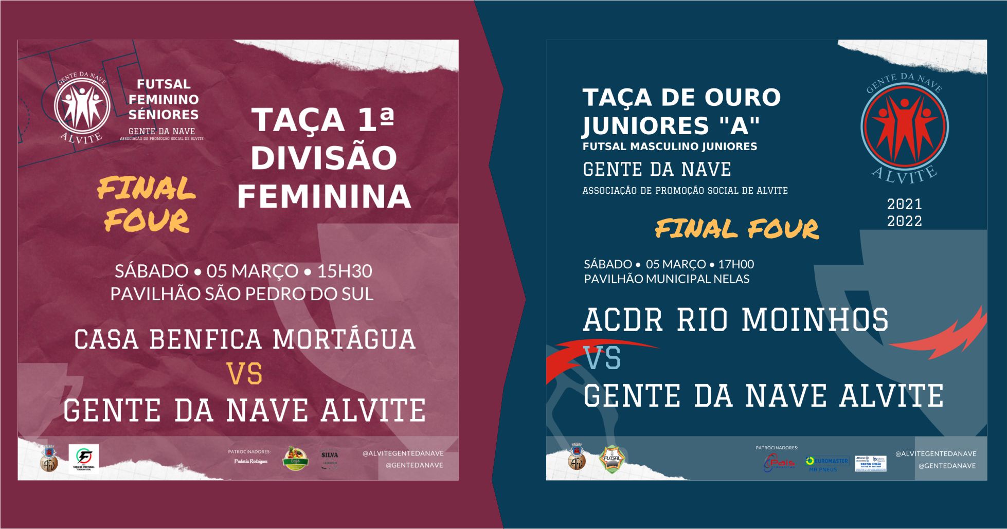 A equipa de Futsal Sénior Feminino (Taça da 1ª Divisão Feminina – Ambiformed) e a de Futsal Júnior Masculino (Taça de Ouro Juniores "A"), ambas defendendo as cores do Gente da Nave - Associação de Promoção Social de Alvite, Moimenta da Beira, estão na Final Four destas duas competições, e jogam este sábado, 5 de março, ‘cartadas’ decisivas. A primeira, com a Casa do Benfica de Mortágua, no Pavilhão Municipal de S. Pedro do Sul, às 15h30; e a segunda, com a ACDR de Rio de Moinhos, no Pavilhão Municipal de Nelas, às 17h00.