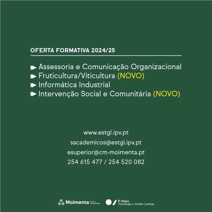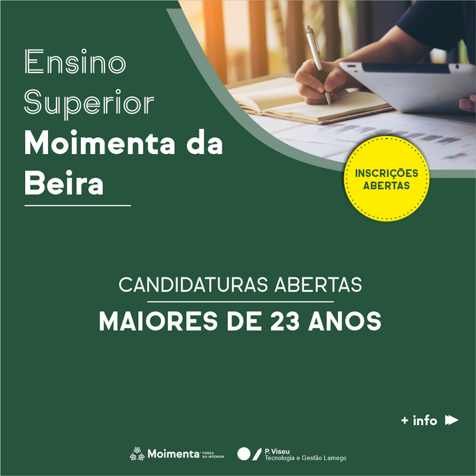Está aberto até dia 15 de março o prazo de receção das candidaturas (maiores de 23 anos), para os quatro Cursos Técnicos Superiores Profissionais (CTeSP) que vão ser ministrados em Moimenta da Beira, no ano letivo 2024/2025: Assessoria e Comunicação Organizacional, Fruticultura/Viticultura, Informática Industrial, e Intervenção Social e Comunitária.