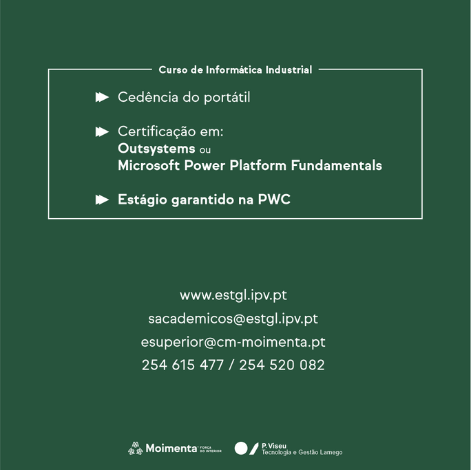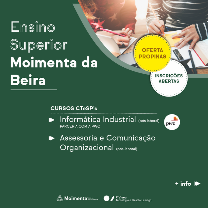 Estão abertas até dia 14 de agosto (1ª fase) as inscrições para os Cursos Técnicos Superiores Profissionais (CTeSP) “Informática Industrial” e “Assessoria e Comunicação Organizacional”, ano letivo 2023/2024, ambos em regime pós-laboral, cursos ministrados em Moimenta da Beira, na Escola Superior Externato Infante D. Henrique, depois de protocolados com a Escola Superior de Tecnologia e Gestão de Lamego, do Instituto Politécnico de Viseu.