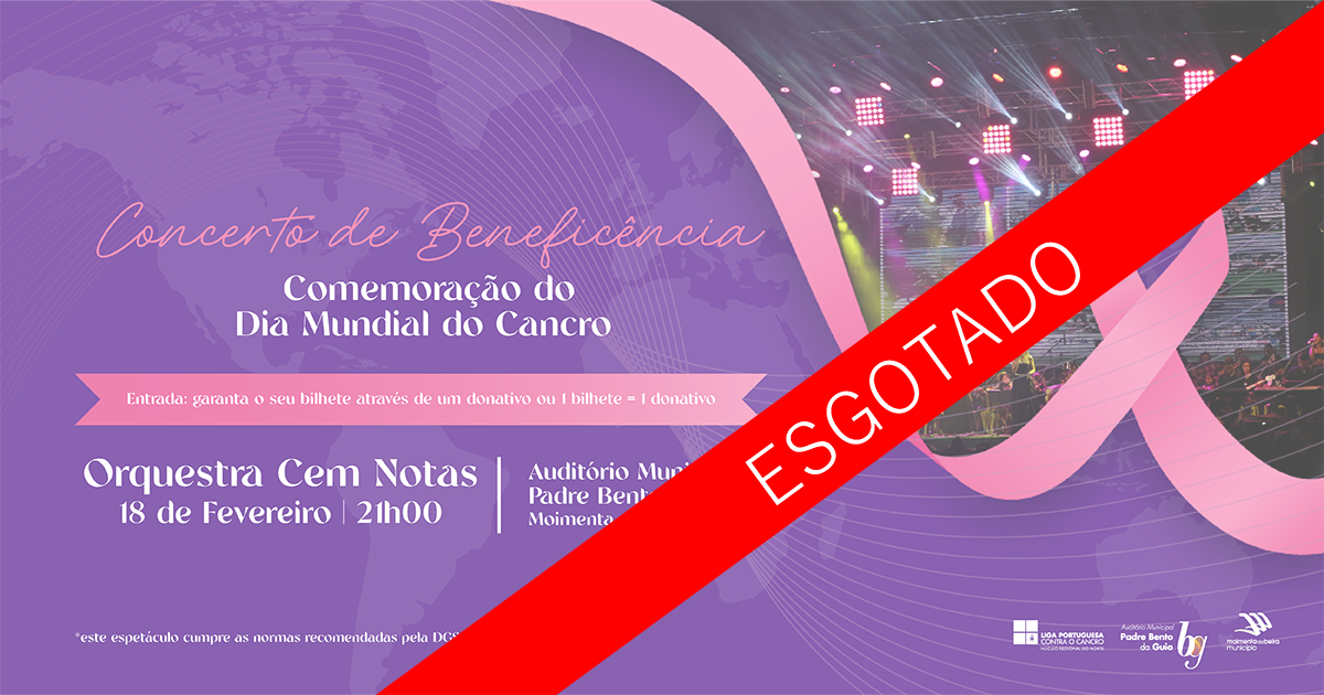 Já não há bilhetes de entrada para o Concerto de Beneficência comemorativo do Dia Mundial do Cancro que terá lugar amanhã, sexta-feira, a partir das 21h00, no Auditório Municipal Padre Bento da Guia. O espetáculo está esgotado! Relembra-se que, para quem adquiriu o ingresso, é obrigatório o uso de máscara e a apresentação do certificado de vacinação ou de recuperação, ou teste negativo.