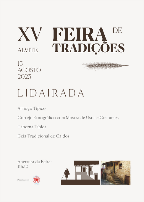 A vila de Alvite, concelho de Moimenta da Beira, vai acolher no próximo domingo, dia 13 de agosto, a “XV Feira de Tradições”. O evento, este ano sob o mote da “Lidairada”, vocábulo do glossário Aquiliniano com o significado de “grande lida; azáfama; canseira; boa vida; vadiagem”, decorrerá como habitualmente no Largo da Tulha. Será assim uma homenagem da Gente da Nave ao Mestre, no ano em que se evocam os 60 anos da sua morte (1963-2023).