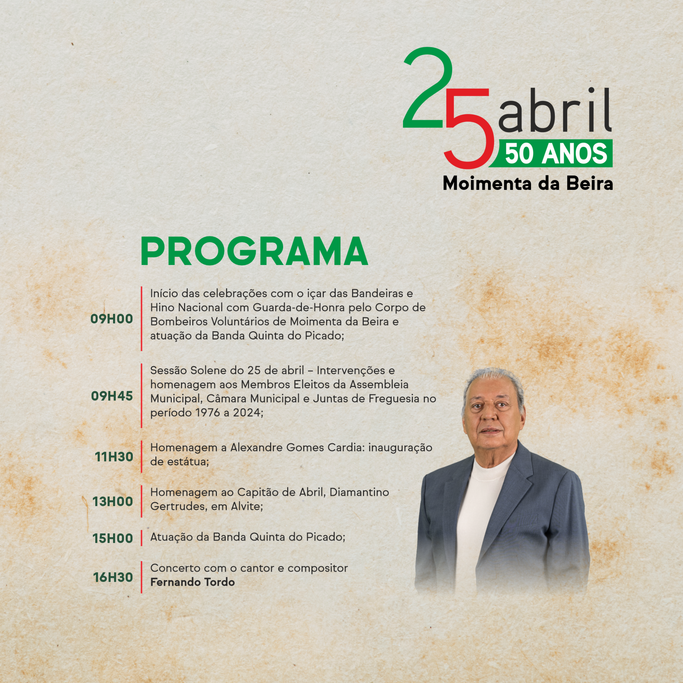 Mas o programa que assinala o cinquentenário da Revolução dos Cravos inclui outros eventos de relevância, em especial as homenagens, a título póstumo, a duas personalidades marcantes da história local, regional e nacional: Alexandre Gomes Cardia, dirigente de associações agrícolas, sociais, culturais e desportivas e ex-presidente da Câmara Municipal de Moimenta da Beira durante dois mandatos (1985/89 e 1989/93), em cuja cerimónia de tributo será descerrado busto que perpetuará a sua memória no largo mais histórico da vila, o Terreiro das Freiras (11h30); e Diamantino Gertrudes da Silva, Capitão de Abril, com a deposição de flores na estátua que lhe foi erguida em Alvite, sua terra-berço (13h00).