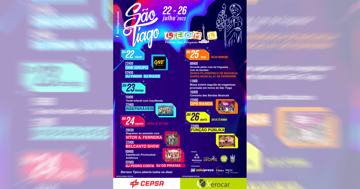Cinco dias de festa em honra do padroeiro São Tiago em Leomil, concelho de Moimenta da Beira. Os festejos vão decorrer de 22 a 26 de julho com um programa recheado de tradições e iniciativas para todas as idades. O dia grande será no 25 de julho, Dia do Padroeiro, com o momento litúrgico da missa solene, seguida da procissão, sempre majestosa, em honra de São Tiago. No recinto estará sempre a funcionar a ‘Barraca Típica’ de comes e bebes.
