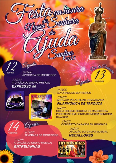 Mas, os arraiais não ficam por aqui! Sanfins prepara-se para receber as festividades em honra de Nossa Senhora da Ajuda de 12 a 14 deste mês. O cartaz anuncia três atuações musicais (Expresso 86, Nacallopes e Entrelynhas) e ainda missa solene seguida de majestosa procissão.
