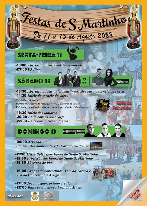 Na aldeia de S. Martinho, os festejos são em honra de São Martinho. Nos dias 11, 12 e 13 haverá bar aberto, torneio de sueca, concertinas, missa e procissão e muita música com o DJ Fire, os Suit Guys, e com os grupos musicais: Sigma e Lusitano Music.