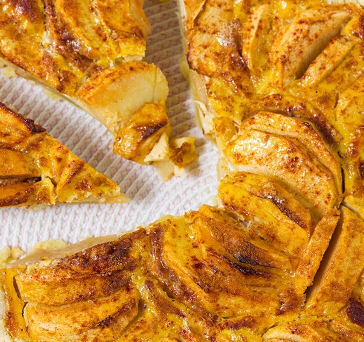 Cobertura: maçã cortada em meia-lua; geleia de maçã (opcional); canela q.b.