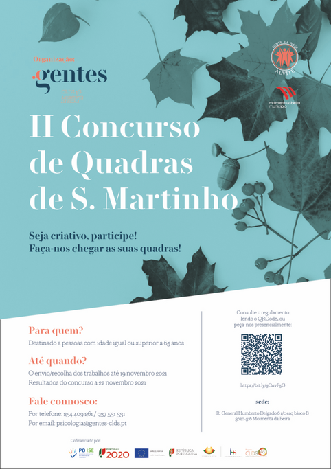 Pelo segundo ano consecutivo, sempre que o Outono está no auge, com o frio a chegar mais agreste, o Gentes CLDS-4G desafia os nossos maiores de 65 anos, que gostem de rimar a dar largas à imaginação, a participar no II Concurso de Quadras de São Martinho.