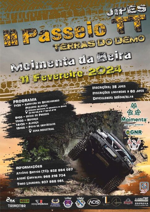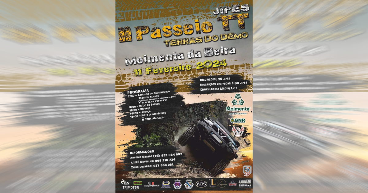Está a chegar uma das provas mais aguardadas do ano. O II Passeio TT de Jipes denominado “Terras do Demo” vai para a estrada no próximo domingo, 11 de fevereiro. A iniciativa, que vai decorrer ao longo de todo o dia, arrancará às 7h30, com a abertura do secretariado, junto ao edifício da Câmara Municipal de Moimenta da Beira.