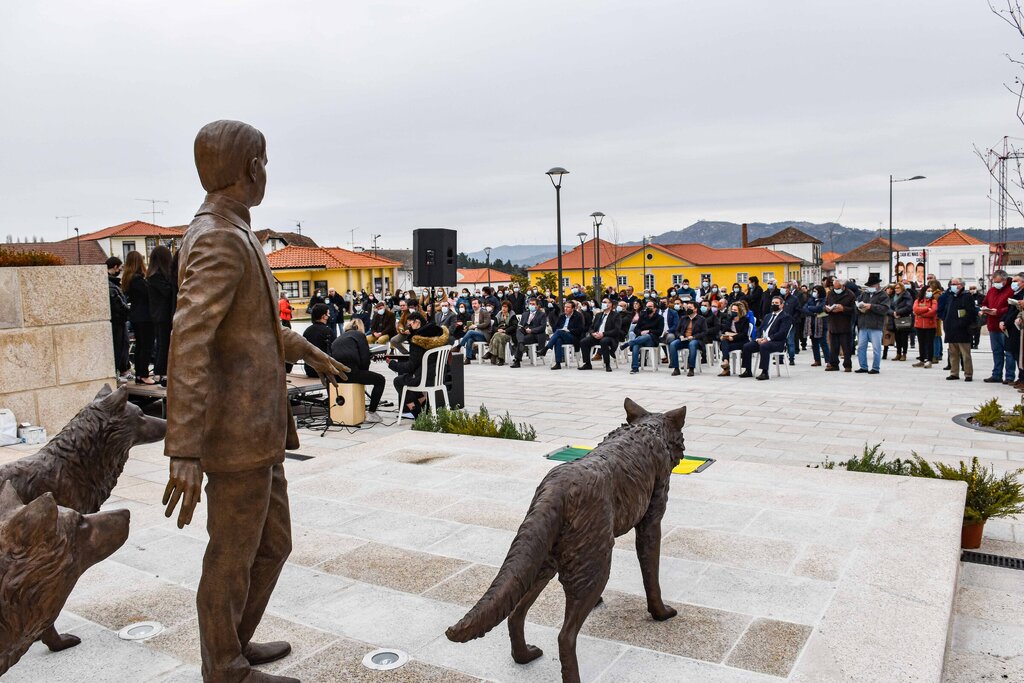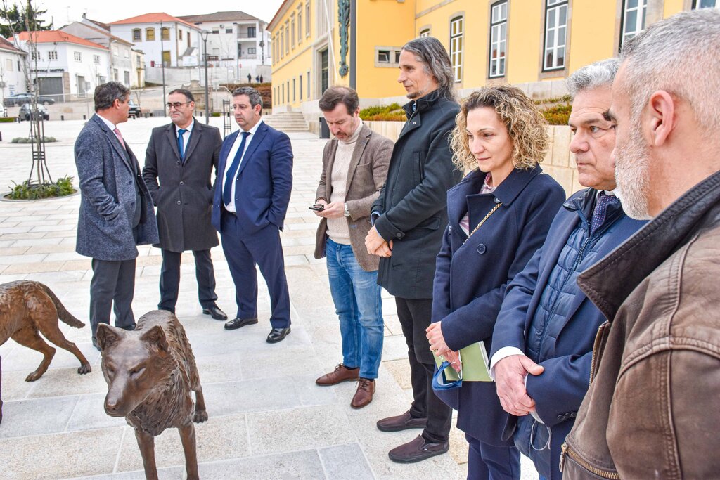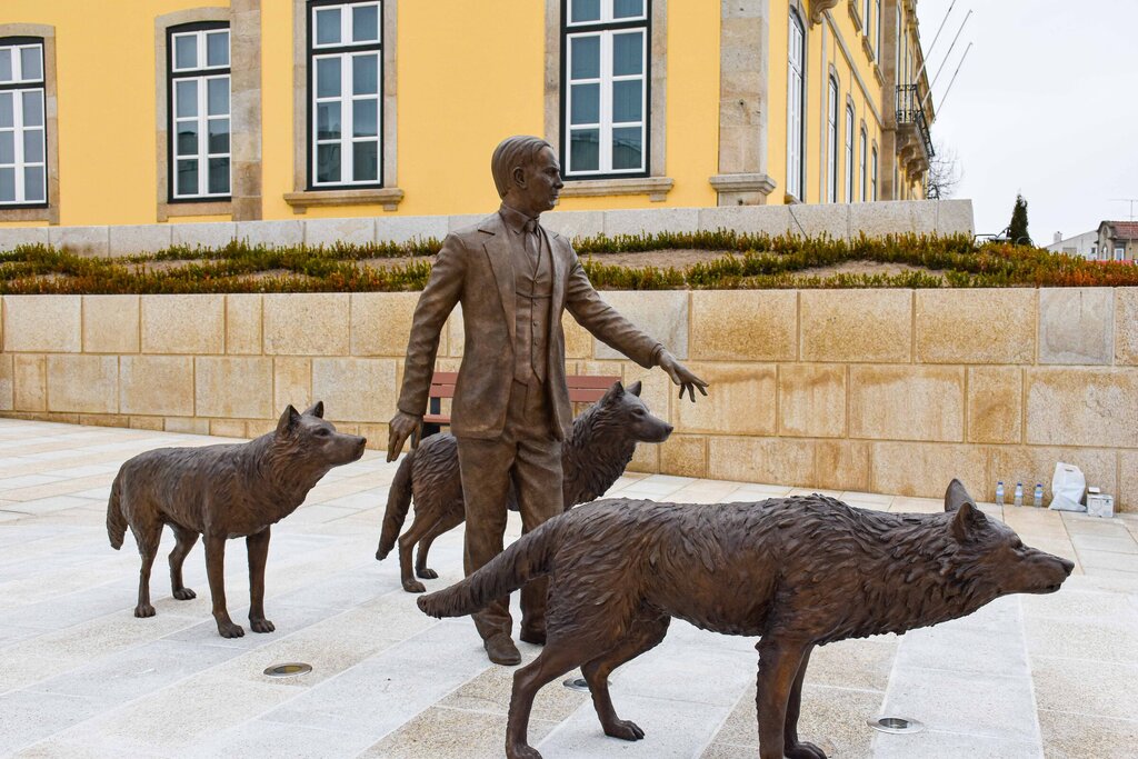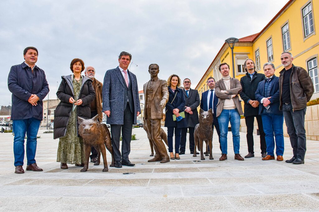 Aquilino Ribeiro rodeado de três lobos. Quatro peças, todas em bronze, todas em tamanho real. Um notável conjunto escultórico de homenagem a Aquilino Ribeiro, mestre das letras, mestre dos mestres, inaugurado este sábado, 26 de fevereiro, na renovada Praça do Tabolado, no coração de Moimenta da Beira.