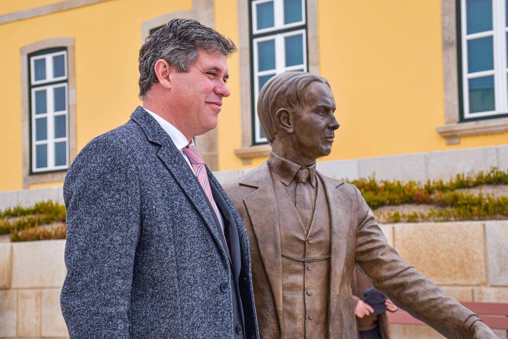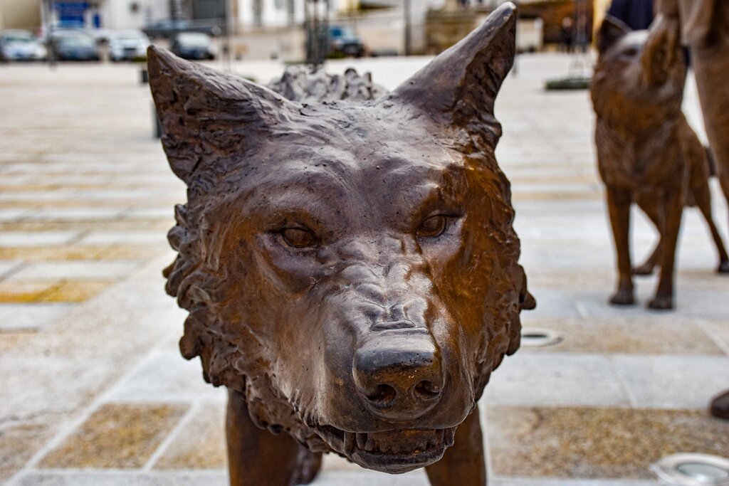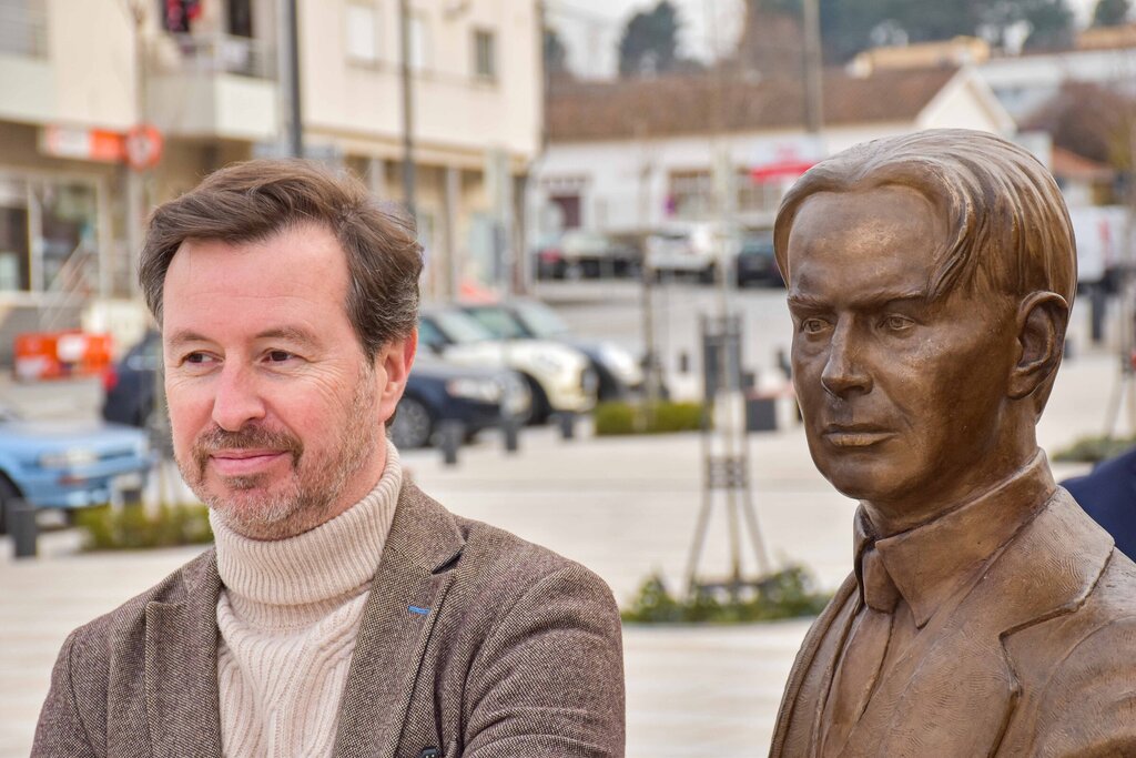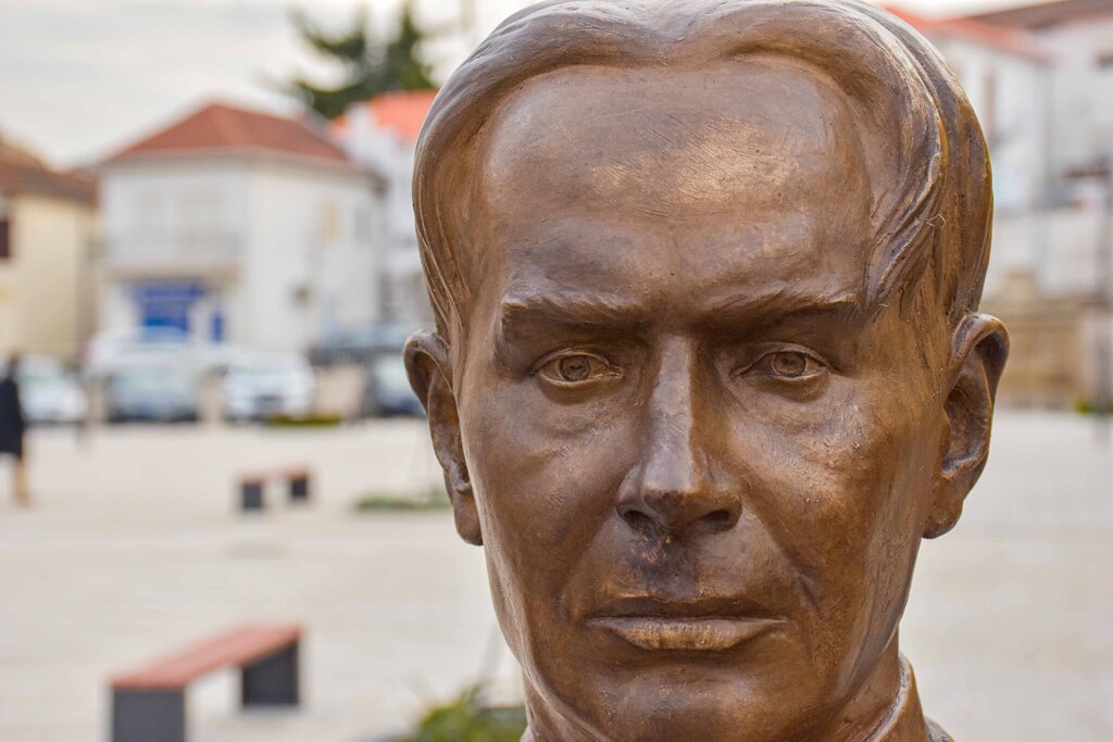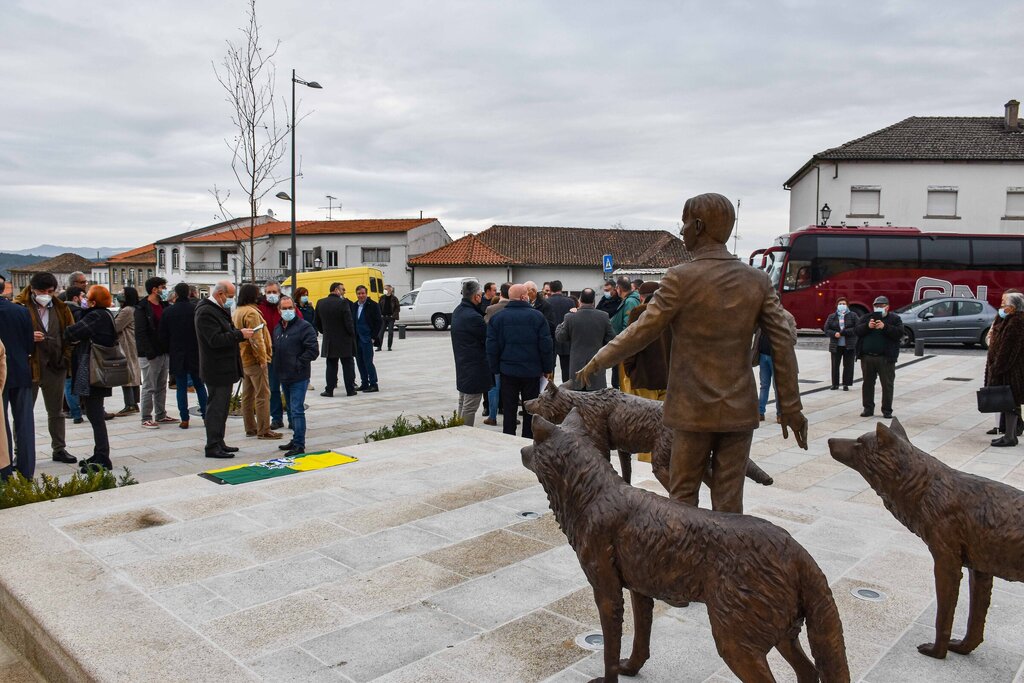 Aquilino Ribeiro rodeado de três lobos. Quatro peças, todas em bronze, todas em tamanho real. Um notável conjunto escultórico de homenagem a Aquilino Ribeiro, mestre das letras, mestre dos mestres, inaugurado este sábado, 26 de fevereiro, na renovada Praça do Tabolado, no coração de Moimenta da Beira.