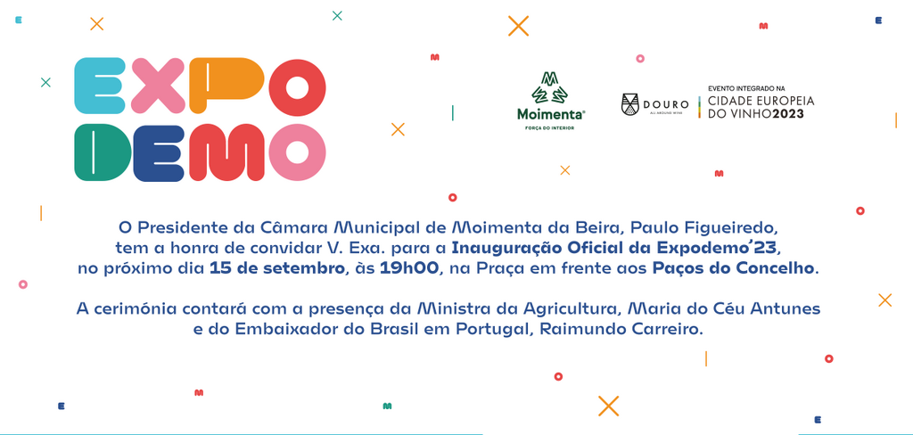 O Presidente da Câmara Municipal de Moimenta da Beira, Paulo Figueiredo, convida toda a população a juntar-se à cerimónia de Inauguração Oficial da Expodemo, na sexta-feira, dia 15 de setembro, às 19 horas, na renovada Praça do Tabolado, em frente aos Paços do Concelho.