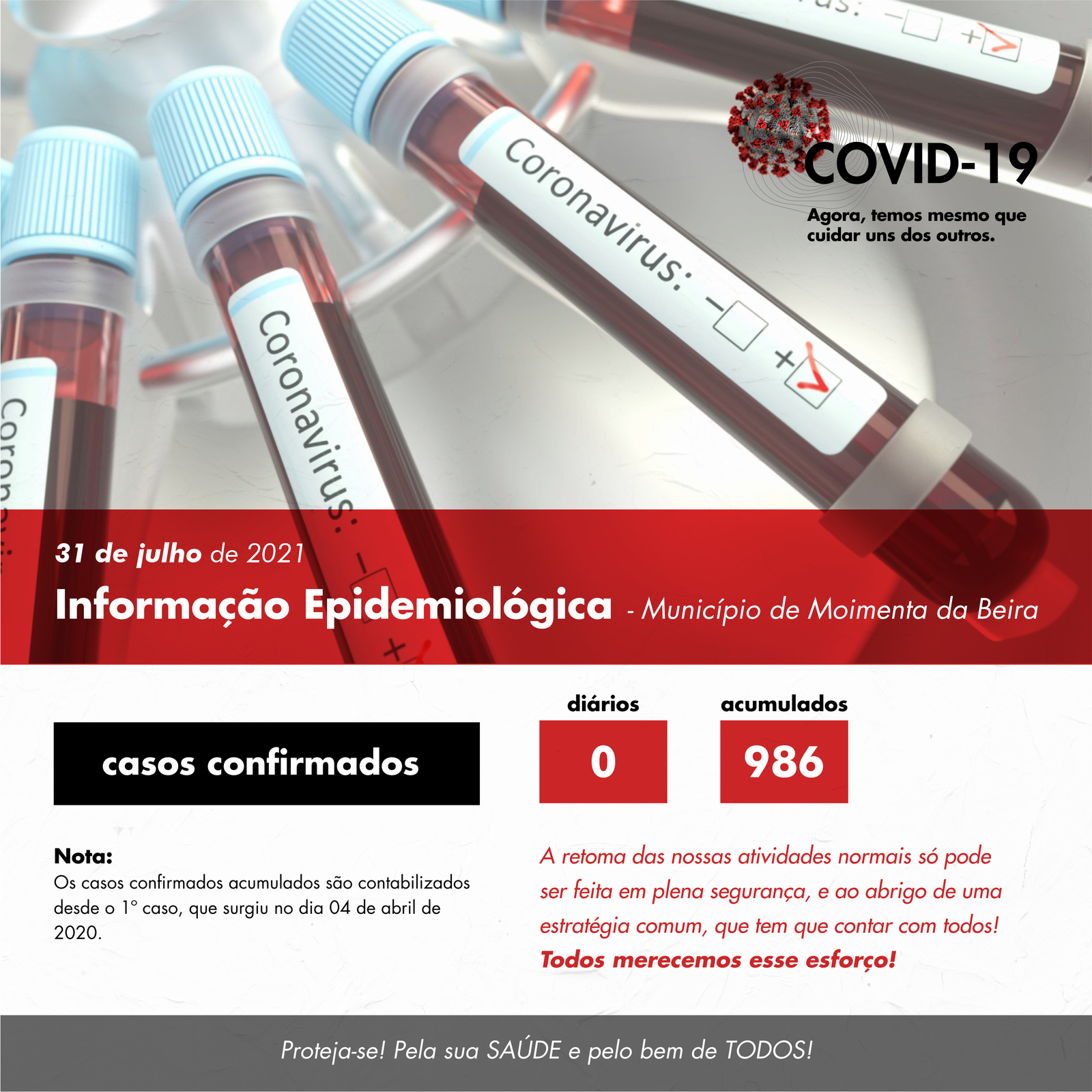Mais um dia (o 4º consecutivo) sem registo de casos positivos de covid-19 no nosso concelho, facto que nos deixa muito satisfeitos.