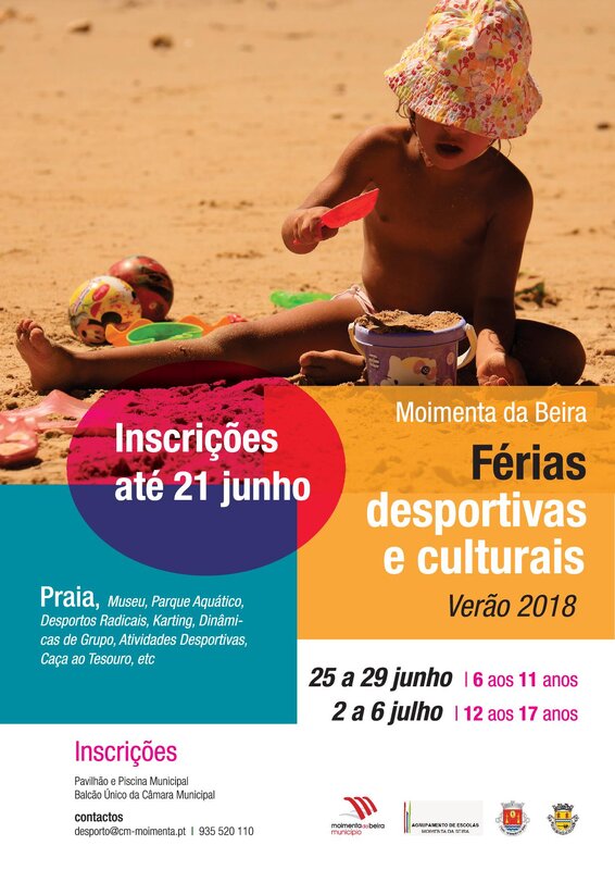 As Férias Desportivas e Culturais que o Município de Moimenta da Beira organiza com o apoio do Agrupamento de Escolas vão dividir-se em dois períodos. O primeiro, de 25 a 29 de junho, destina-se às crianças dos 6 aos 11 anos de idade. E o segundo, de 2 a 6 de julho, às crianças e jovens dos 12 aos 17 anos.