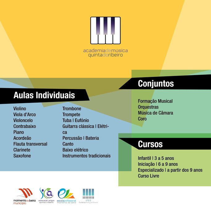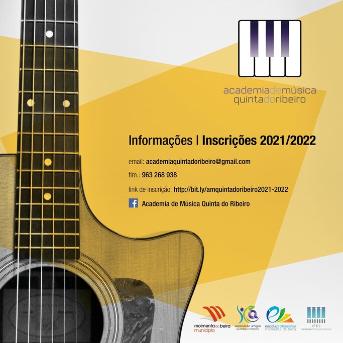 Continuam abertas as inscrições para o ano letivo 2021/2022 da Academia de Música Quinta do Ribeiro. As matrículas para as aulas individuais ou em conjunto podem ser feitas aqui, também pelo email, na página do facebook ou pelo contacto telefónico: 963 268 938.