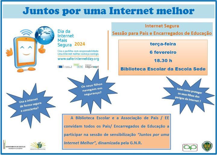 Assim, nesse âmbito, a Biblioteca Escolar, em parceria com a Associação de Pais/EE, irá naquele dia, às 18h30, uma sessão de sensibilização dinamizada por militares da GNR, sobre o uso seguro da internet. O evento terá lugar na Biblioteca Escolar da Escola Sede de Moimenta da Beira, e é aberto a todos os Pais e Encarregados de Educação.