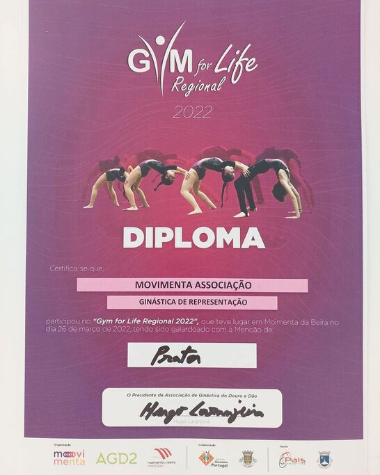 A “Movimenta Associação”, com a Classe de Ginástica de Representação, conquistou a Menção de Prata no Gym For Life Regional 2022 que decorreu no passado sábado, dia 26 de março, em Moimenta da Beira. A distinção abre portas à sua participação no Gym for Life Portugal 2022, no Pavilhão Multiusos de Odivelas, entre os dias 23 a 25 de abril.