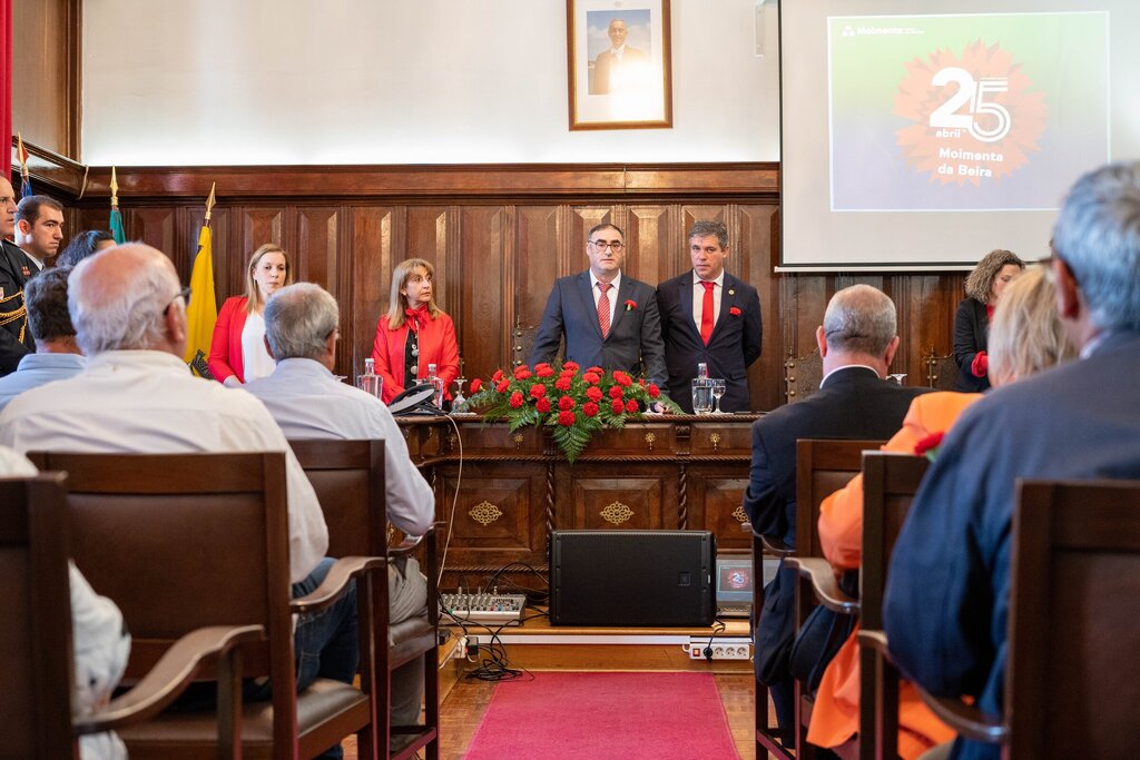 As comemorações começaram às 10 horas com Sons de Abril, pela Sociedade Musical Vouzelense, e prosseguiram com o içar das Bandeiras e Hino Nacional, com Guarda-de-Honra pelo Corpo de Bombeiros Voluntários de Moimenta da Beira. Logo depois, o ato de deposição de cravos no monumento que celebra o 25 de Abril, e imediatamente a seguir a sessão solene no Salão Nobre dos Paços do Concelho com os discursos protocolares, o primeiro dos quais do Presidente da Assembleia Municipal, João Xavier, que, a meio da comunicação, recordou a “Revolução dos Arcos” para afirmar que “Moimenta da Beira sempre esteve do lado certo”. Essa “revolução”, convém rememorar, ocorreu há seis décadas e abalou a ditadura de Salazar. Meteu agentes da pide, guardas da GNR, prisões, ordens e contraordens de Viseu e Lisboa, sinos a tocar a rebate, estudantes em protesto e uma revolução popular. Tudo por causa dos arcos do Externato Infante D. Henrique, cujo desenho havia sido inspirado na obra do arquiteto brasileiro Oscar Niemeyer, e que o regime quis à força demolir. As curvas dos arcos de Niemeyer, génio da arquitetura universal, ainda por cima um ‘perigoso’ comunista, eram demasiado arrojadas para um país em ditadura, fechado a novos conceitos artísticos e demasiadamente conservador, e por isso tinham de ser demolidas. Não foram, pese embora a força policial que então se fez sentir. João Xavier, que no discurso condenou e repudiou a guerra na Ucrânia perpetrada pela Rússia, disse ainda que “Abril é uma obra sem fim para Portugal e para os portugueses” e que “os direitos consagrados na Constituição dão vida à democracia”.