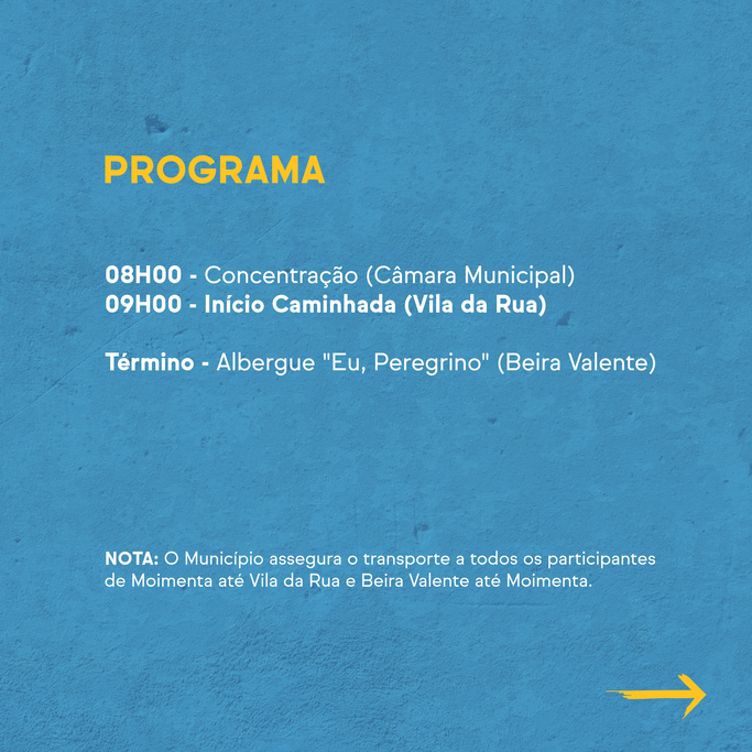 Às 9 horas, a caminhada partirá em direção a Beira Valente, seguindo as diretrizes dos ‘Caminhos de Santiago’. Ao longo do percurso de 11 km, os caminhantes irão percorrer diversas localidades do município, que terminará no Albergue “Eu, peregrino”. No local existirá transporte de retorno para Moimenta da Beira.