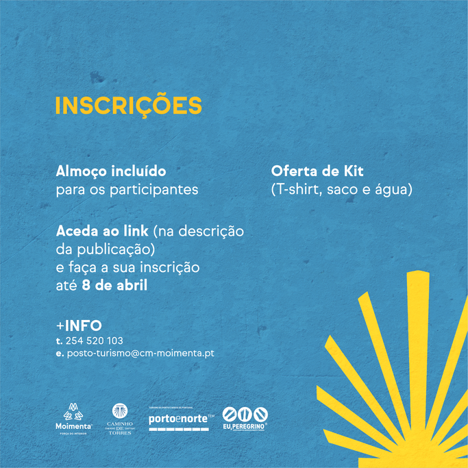 Estão a decorrer até 8 de abril as inscrições para a caminhada “Moimenta no Caminho de Torres”, a realizar no dia 14 de abril. Com ponto de encontro às 8 horas, em frente à Câmara Municipal de Moimenta da Beira, os participantes serão transportados de autocarro até à meta de partida, em Vila da Rua.