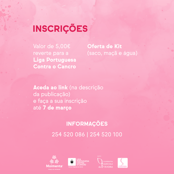 Para participar nesta iniciativa organizada pela Câmara Municipal de Moimenta da Beira através dos Gabinetes da Ação Social e do Desporto, terá de efetuar uma inscrição obrigatória, até dia 7 de março, onde poderá selecionar a opção de aquisição do kit. As receitas obtidas nos Kits revertem na totalidade para a Liga Portuguesa Contra o Cancro.