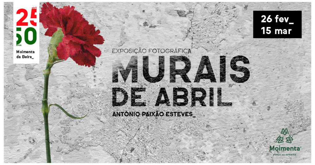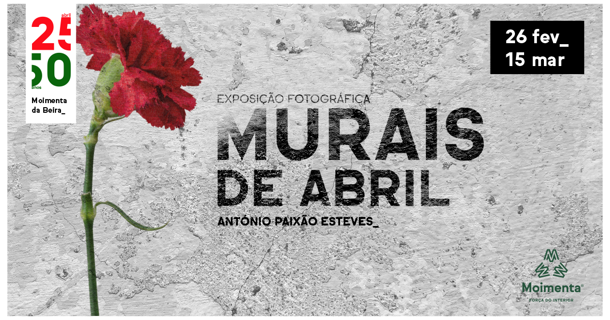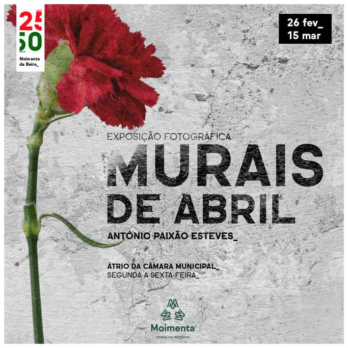 No ano em que se celebram os 50 anos da Revolução dos Cravos, o átrio da Câmara Municipal de Moimenta da Beira vai ter patente ao público, de 26 de fevereiro a 15 de março, a exposição fotográfica “Murais de Abril” de António da Paixão Esteves.