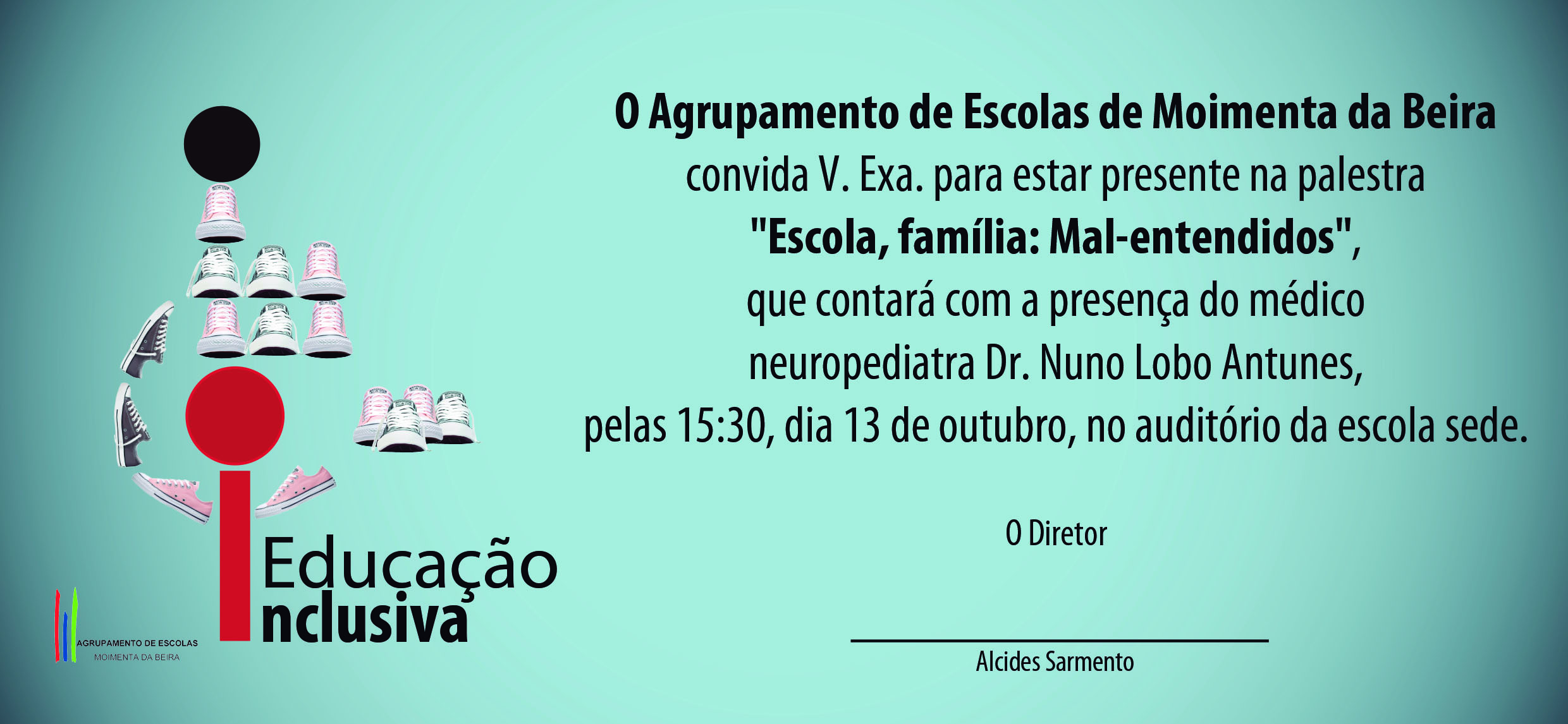 O médico neuropediatra Nuno Lobo Antunes vai estar em Moimenta da Beira no próximo sábado, 13 de outubro, para a palestra “Escola, família: Mal-entendidos”, promovida pelo Agrupamento de Escolas, que terá lugar no auditório da escola sede, com início marcado para as 15h30. O evento é aberto a toda a comunidade.