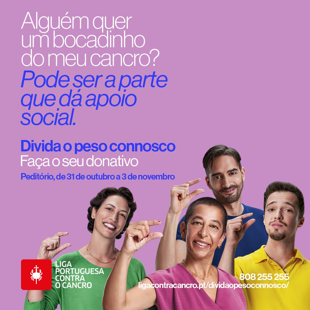 Este ano, com música cedida por Jorge Palma, “A gente vai Continuar”, a campanha de comunicação do Peditório Nacional é protagonizada por pessoas reais que sofrem de cancro e desafiam Portugal a partilhar o seu “Peso”, contribuindo tal como a LPCC tem feito, ao longo dos anos, através do apoio prestado aos doentes e famílias, para aliviar o “peso” do cancro na vida das pessoas.