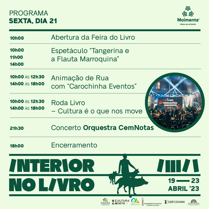 Nos dias seguintes, sempre com o espaço da Feira do Livro em funcionamento, sublinha-se a atuação da Orquestra CemNotas, na sexta-feira à noite (21h30); os momentos infantis na quinta, sexta, sábado e domingo; e ‘O canto das palavras’, no sábado, a partir das 14h30, que inclui poesia e música a cargo da excelência dos convidados 'Grupo de Violas e Cavaquinhos da Universidade Sénior Rotary em Matosinhos', da ‘Turma de Escrita e Poesia’ da mesma Universidade e do Clube de Poesia de Moimenta da Beira ´Pingos Poéticos’.