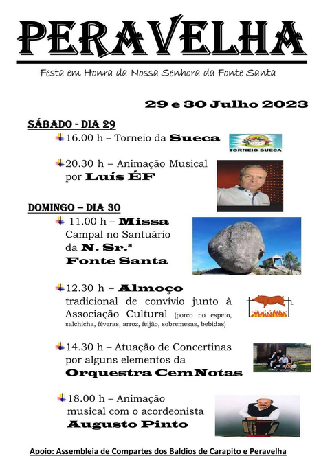 Os festejos em honra de Nossa Senhora da Fonte Santa, em Peravelha, terão início no sábado, dia 29, às 16 horas, com a realização de um torneio de sueca. O programa, de dois dias, contará com muita animação musical, atuação de concertinas, Missa Campal no Santuário e ainda um almoço convívio junto à Associação Cultural.