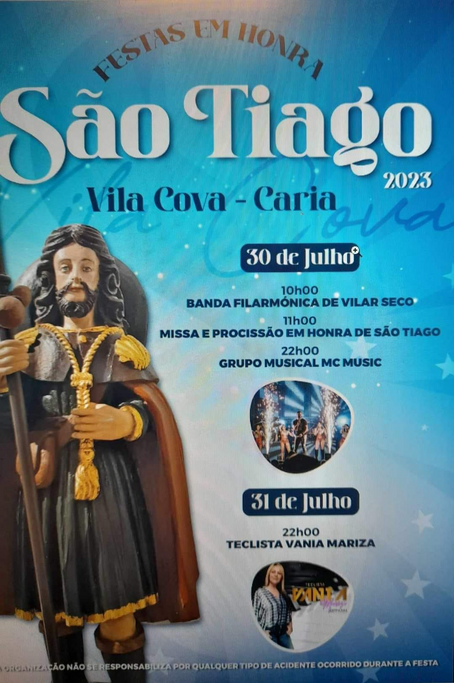 Nos dias 30 e 31 de julho, em Vila Cova, freguesia de Caria, as festas são em honra de S. Tiago. O dia grande é no domingo, 30, com a Eucaristia e Procissão. Haverá ainda atuações da Banda Filarmónica de Vilar Seco e do grupo musical MC Music. As festividades encerram no dia seguinte com a teclista Vânia Mariza.