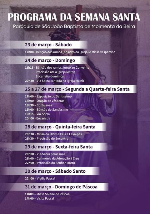 Já é conhecido o programa das celebrações da Semana Santa na Paróquia de São João Baptista, em Moimenta da Beira. A intensa semana que recorda os últimos dias da vida terrena de Cristo tem início no próximo sábado 23 de março, às 17 horas, com Bênção dos ramos (no adro da igreja) e Missa vespertina, e termina no Domingo de Páscoa, dia 31, com Procissão da Ressurreição e Missa às 11 horas, e Visita Pascal a partir das 14 horas.